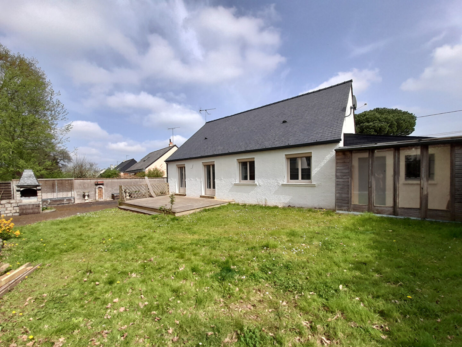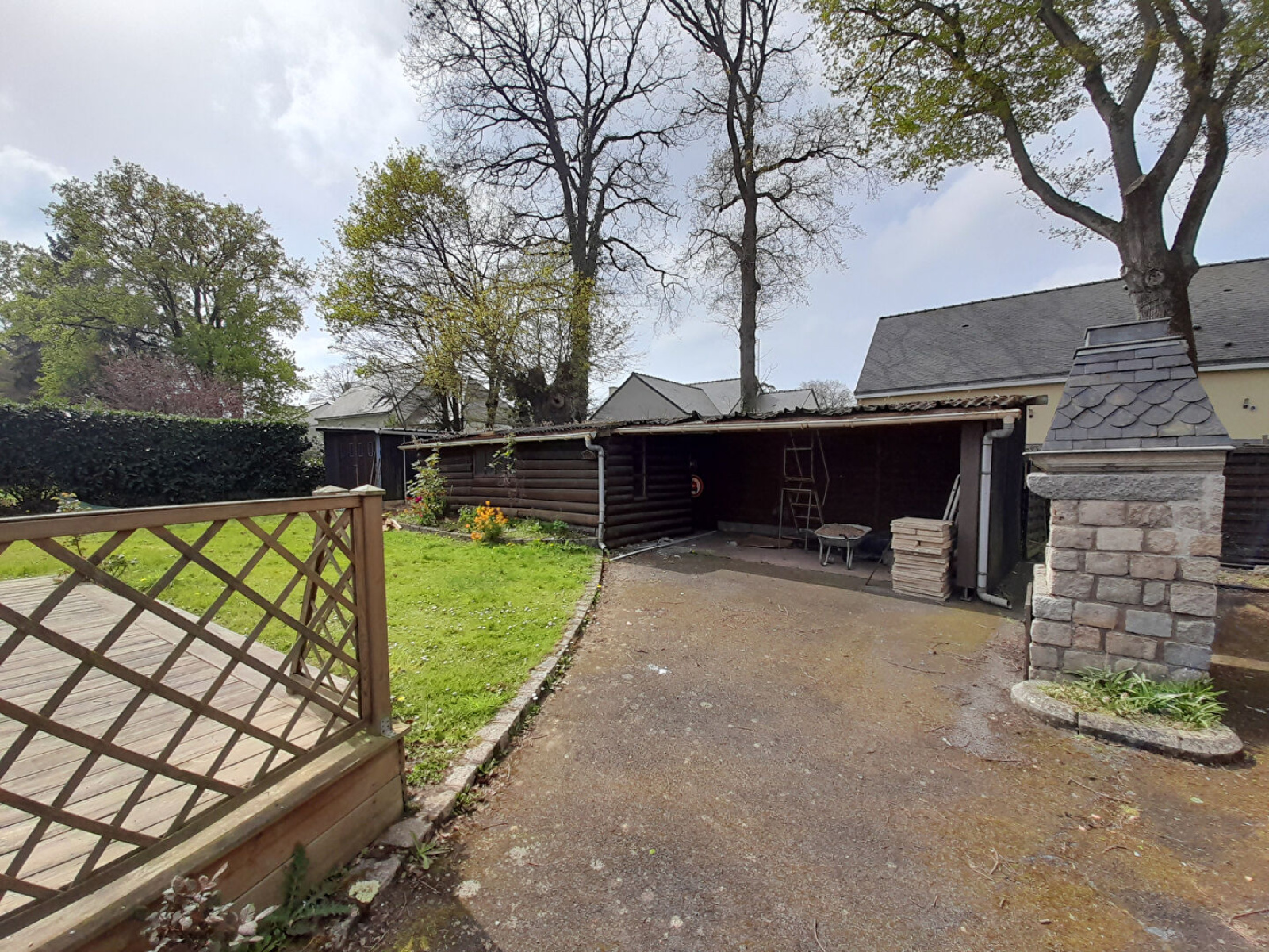 Un garage attenant à la maison, un jardin clos avec terrasse et dépendances, le tout sur un terrain d'environ 600m².